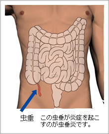 大腸はちょうどお腹を右下から始まり、ぐるりと回ってお尻まで到達し、おしりの穴“肛門”につながります。 虫垂はこの大腸の始まりの部分である盲腸にしっぽのようにヒョロっとくっついています(図参照)。 |