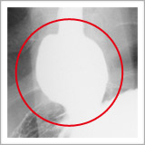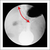 検査をすると、胃と食道の境目がゆるくて胃の一部が食道側に飛び出し(図1、図2)、一度胃に入ったバリウムが食道に戻ってきます(図3)