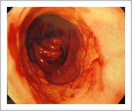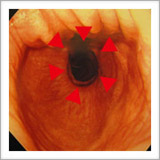 | 胃カメラ検査でも胃と食道のつなぎ目に近い食道粘膜は、ほぼ全周にわたって赤くただれ、粘膜が剥がれ落ち、潰瘍を作っていました(右図)。この潰瘍からは悪性の細胞は見つからなかったので、胃酸が逆流してできた潰瘍と考えられます。 |